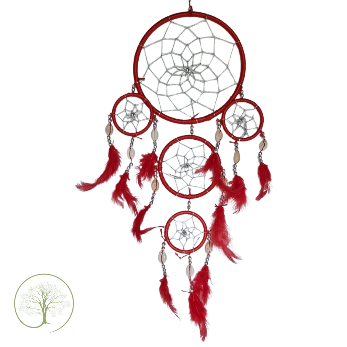 Dromenvanger rood met kralen, veren en schelpjes